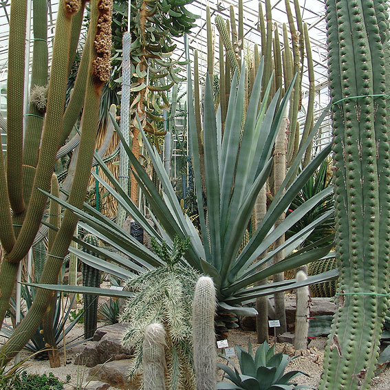Großes Bild links: stammbildende Agave decipiens neben einer Gärtnerassemblage oder doch gewachsen?