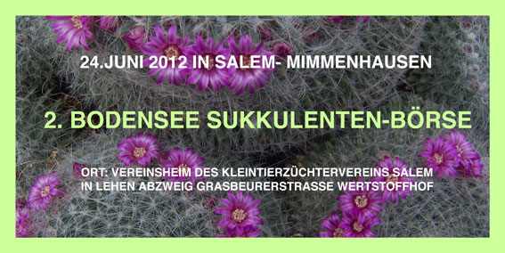 AM 24.6.2012 findet die 2. Bodensee Sukkulenten-Börse in Salem- Mimmenhausen statt. Bodensee-Sukkulenten und die Börsianer würden sich freuen Sie zum regen Handel begrüßen zu dürfen, garantiert ohne Leerverkäufe. |
