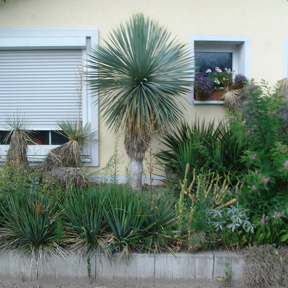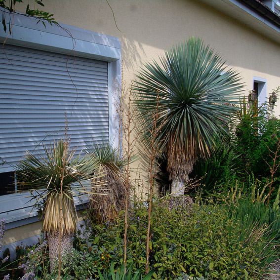 Großes Bild links: Yucca rostrata hinten, mit Yucca thompsoniana und reichlich abgeblühten Blütenständen von Yucca flaccida.