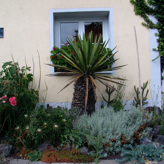 Nicht weit entfernt, grasen Bisons und Wisente, die amerikanischen und europäischen Büffel. Auf nur einem Meter breiten Streifen vor dem Haus finden sich einige sukkulente Sehenswürdigkeiten, wie die Yucca rostrata und die Yucca carnerosana. Aber auch im Dickicht darunter gab es eine Überraschung, eine abgeblühte Agave victoria reginae in direkter Nachbarschaft mit alpiner Flora und mediterranen Kräutern.