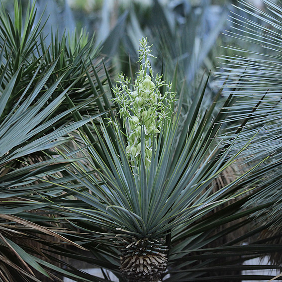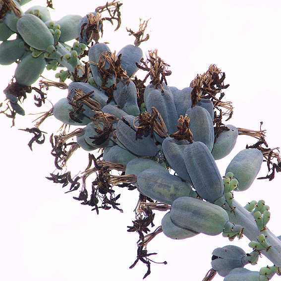 Unten rechts: Agave lophanta mit blauen Samenkapseln